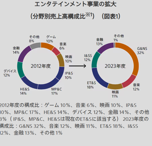 「ソニーは近年、エンタテインメント事業の成長を⼤きく加速させてきました。特に、吉田がCEOに就任した2018年度以降は、Purposeのキーワードである「感動」を軸に、ゲーム、⾳楽、映画など人の心を動かすエンタテインメント事業の強化を加速してきました。2012年度には、エンタテインメント3事業(ゲーム、⾳楽、映画)の売上高構成比は26%でしたが、2023年度には55%にまで伸長しています(図表 1)。」