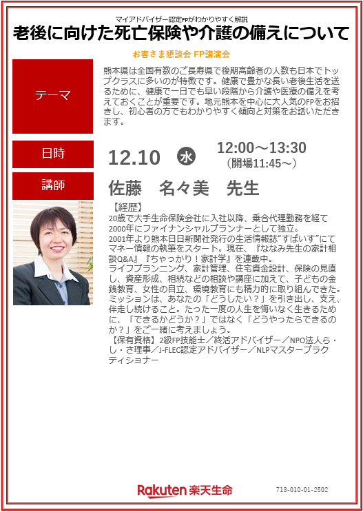 AFP/マイアドバイザー®の 佐藤 名ゝ美 さんが以下の講演会で講師を務めました。